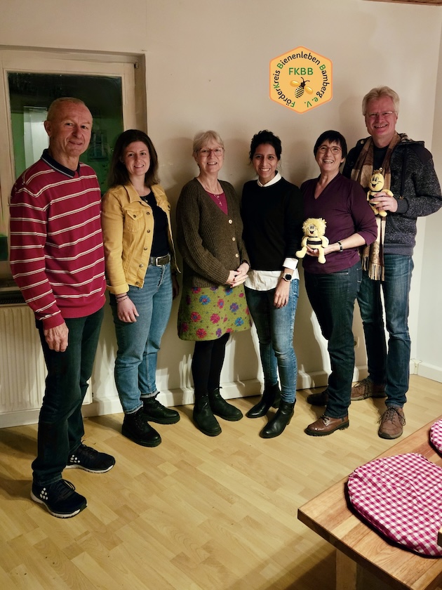 FKBB-Vorstand 2025 / Förderkreis Bienenleben Bamberg e. V. v. l.: Nikolaus Hofmann (Beirat), Marie Pailer, Gabriele Loskarn (Kassenwartin), Yaneth Klein (Beirätin), Ilona Munique (1. Vors.), Reinhold Burger (2. Vors.), Maja und Willi (Ständiger „Beisitz“); nicht im Bild: Prof. Heidrun Alzheimer