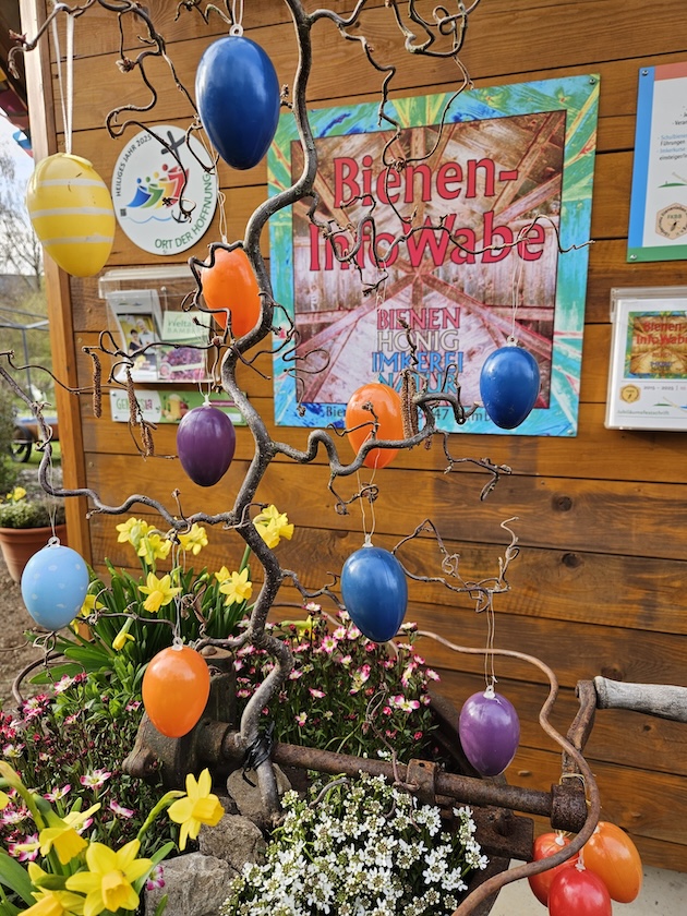 Der Osterbrunnen war geschmückt, und der „Tag der offenen Tür“ mit Rähmchenweitwurf, Bienenwabenbasteln und natürlich Kaffee lockte etliche Familien an. Sie kamen aus Pommersfelden, Zapfendorf, Hassfurt und Schlüsselfeld, weil’s dort in den jeweiligen Presseorganen gemeldet war. Nur im FT suchte man vergebens nach einen Eintrag – schade. Doch uns wurde dennoch nicht langweilig.