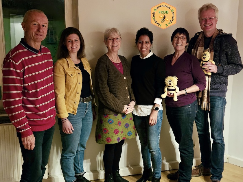 FKBB-Vorstand 2025 / Förderkreis Bienenleben Bamberg e. V. v. l.: Nikolaus Hofmann (Beirat), Marie Pailer, Gabriele Loskarn (Kassenwartin), Yaneth Klein (Beirätin), Ilona Munique (1. Vors.), Reinhold Burger (2. Vors.), Maja und Willi (Ständiger „Beisitz“); nicht im Bild: Prof. Heidrun Alzheimer