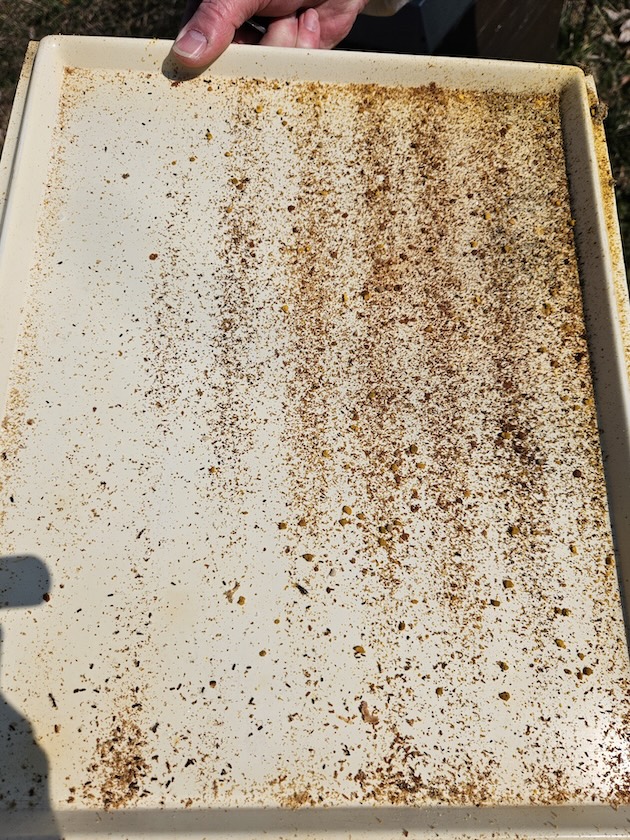 Bewährt haben sich Gitter mit einer Maschenweite von 8 mm. Im Handel werden auch Gitter mit einer Maschenweite von 6,3 mm angeboten. Damit geht man auf Nummer sicher, dass keine Spitzmäuse in die Bienenstöcke eindringen können. Die Bienen haben allerdings einige Mühe, durch diese engen Maschen hindurch zu krabbeln. Außerdem bleiben die Pollenhöschen daran hängen. Darum bevorzugen wir die größere Maschenbreite und hatten bislang auch das Glück, dass unsere hiesigen Spitzmäuse in der „Genussregion Bamberg“ offenbar eine kräftigere Bauchmitte besitzen 😉.