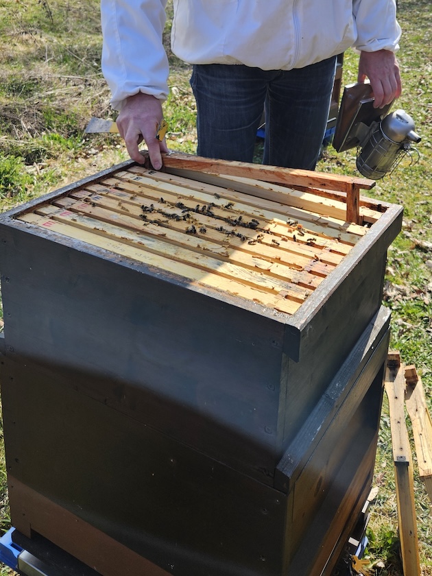 Sofern noch nicht Ende Oktober geschehen, ist spätestens jetzt der Zeitpunkt, die Mäusegitter an den Völkern anzubringen. Falls das Flugloch zum Schutz vor Räuberei oder Wespen eingeengt ist, wird es zuerst gänzlich geöffnet.